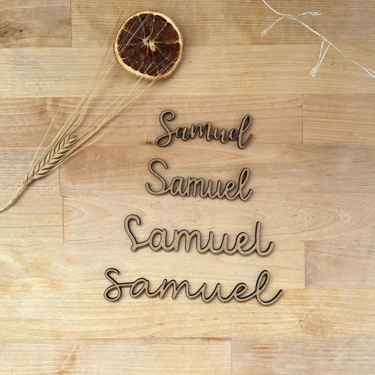 Nuestros marcasitios de madera añadirán un toque elegante a tu decoración de mesa. El material MDF con un grosor de 3 mm asegura que los marca sitios sean duraderos y de alta calidad. La altura del nombre será de 30 mm y el largo estará determinado por el nombre.